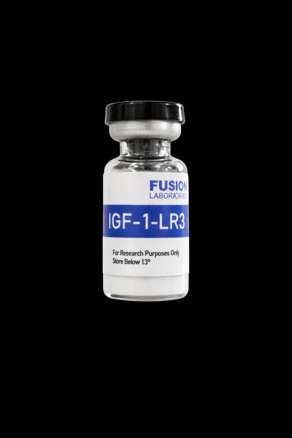 This product is a small vial labeled IGF-1 LR3 from Fusion Laboratories. The packaging indicates it is for research purposes only and includes storage guidance to keep it below 13°. The label also notes 1 mg and lyophilized, 98% purity.